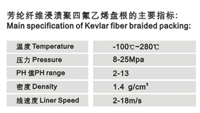 芳纶纤维盘根由芳纶纤维浸渍聚四氟乳液和润滑剂处理编织而成。有较好的耐化学性,高回弹,低冷流。具有极好的高转速、高模数的性质(被称为人造金属线)。所以,与其它类型的盘根比较,它能抵抗颗粒结晶介质和更高的温度既可单独使用也可与其它盘根组合。在泵系统上是很好的石棉替代产品。
