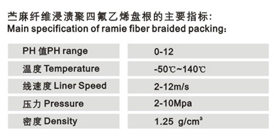 由经四氟乳液处理过的高质量苎麻线,在方形纺织过程中再次充分浸渍色泽较浅的特殊四氟乳液及阻隔剂,它不会使产品受到污染.少维护,易安装,对泵轴或阀杆不会造成磨损.